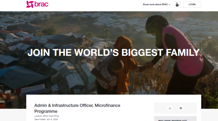 BRAC–এর মাইক্রোফাইন্যান্স প্রোগ্রামে প্রশাসনিক ও অবকাঠামো কর্মকর্তা পদে জনবল নিয়োগের জন্য বিজ্ঞপ্তি প্রকাশ করা হয়েছে। আগ্রহী প্রার্থীরা আগামী ১৪ এপ্রিল ২০২৬ পর্যন্ত আবেদন করতে পারবেন। read more